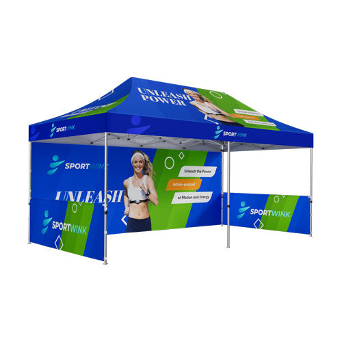 In order to ensure that we’re able to create the perfect custom printed marquees for you and your business, we offer many different layouts to choose from. You can choose to enclose one or more sides with fabric panels in different heights, or you can leave all four sides open.